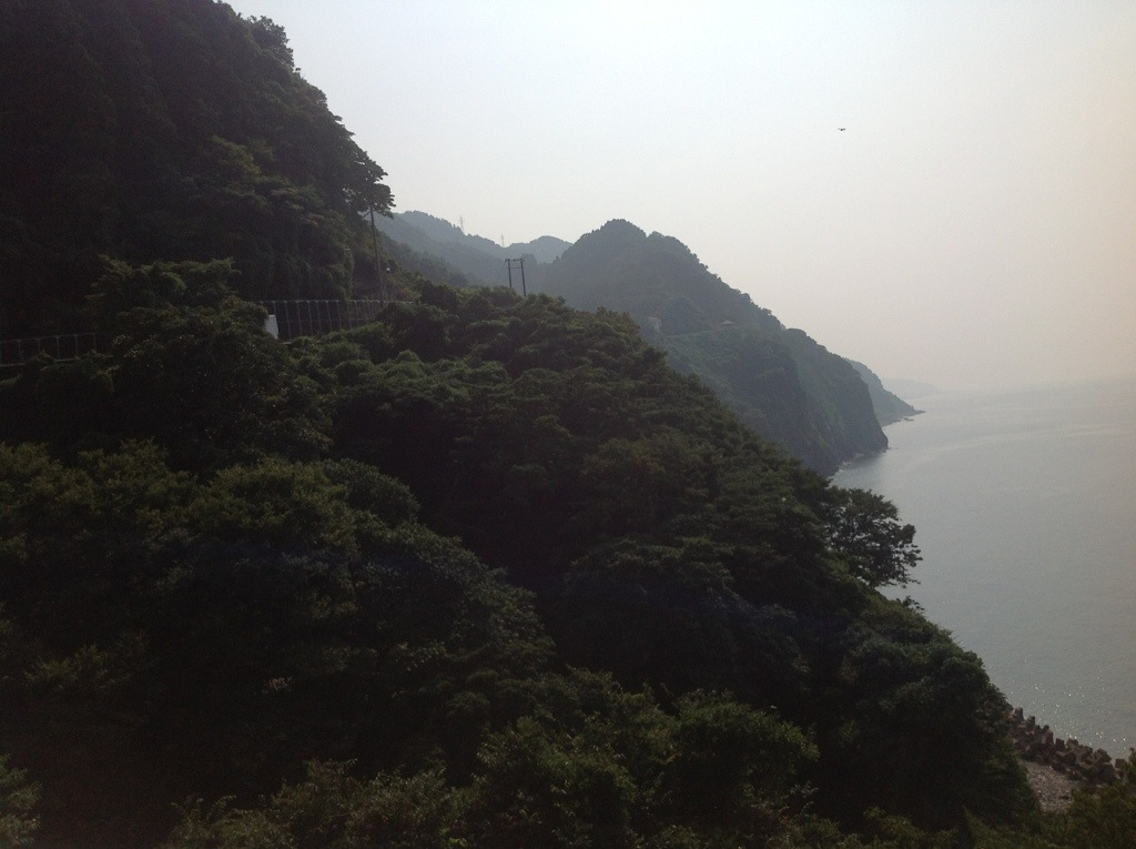 The home stretch from Itiogawa left the flat shoreline behind in favour of rocky cliff face. The path rose and fell, but none of the rises were extended climbs. The drop onto the ocean was so sheer that the road itself was pretty much s tunnel attached to the rock face. The main motorway was built right out over the sea,the concrete struts holding it up plunging into the ocean. Being a bicycle though, it was forbidden to ride on this road.