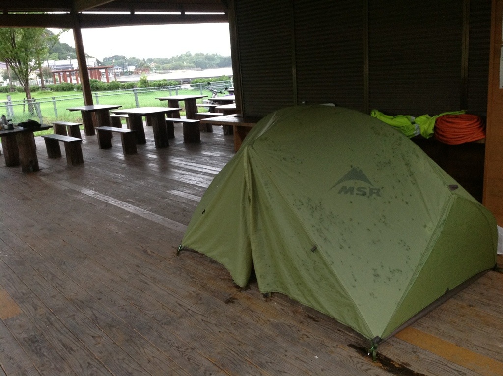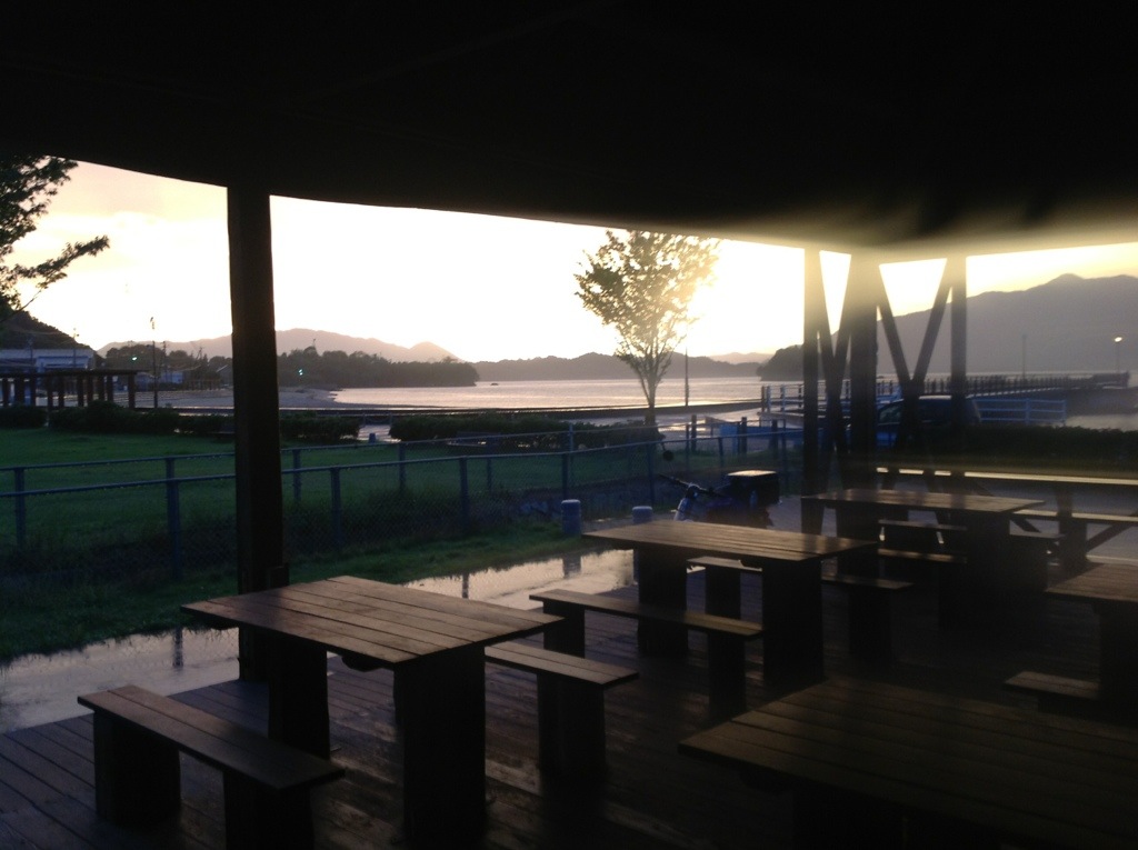 After lunch it got rainy. I wanted to camp on one if the islands. The second to last island, Innoshima had a nice campground. Once again I was the only one there, but the groundskeeper there let me set up in what I think is used as a lunch area during the high season. It was great, provided shelter from the rain and wind.