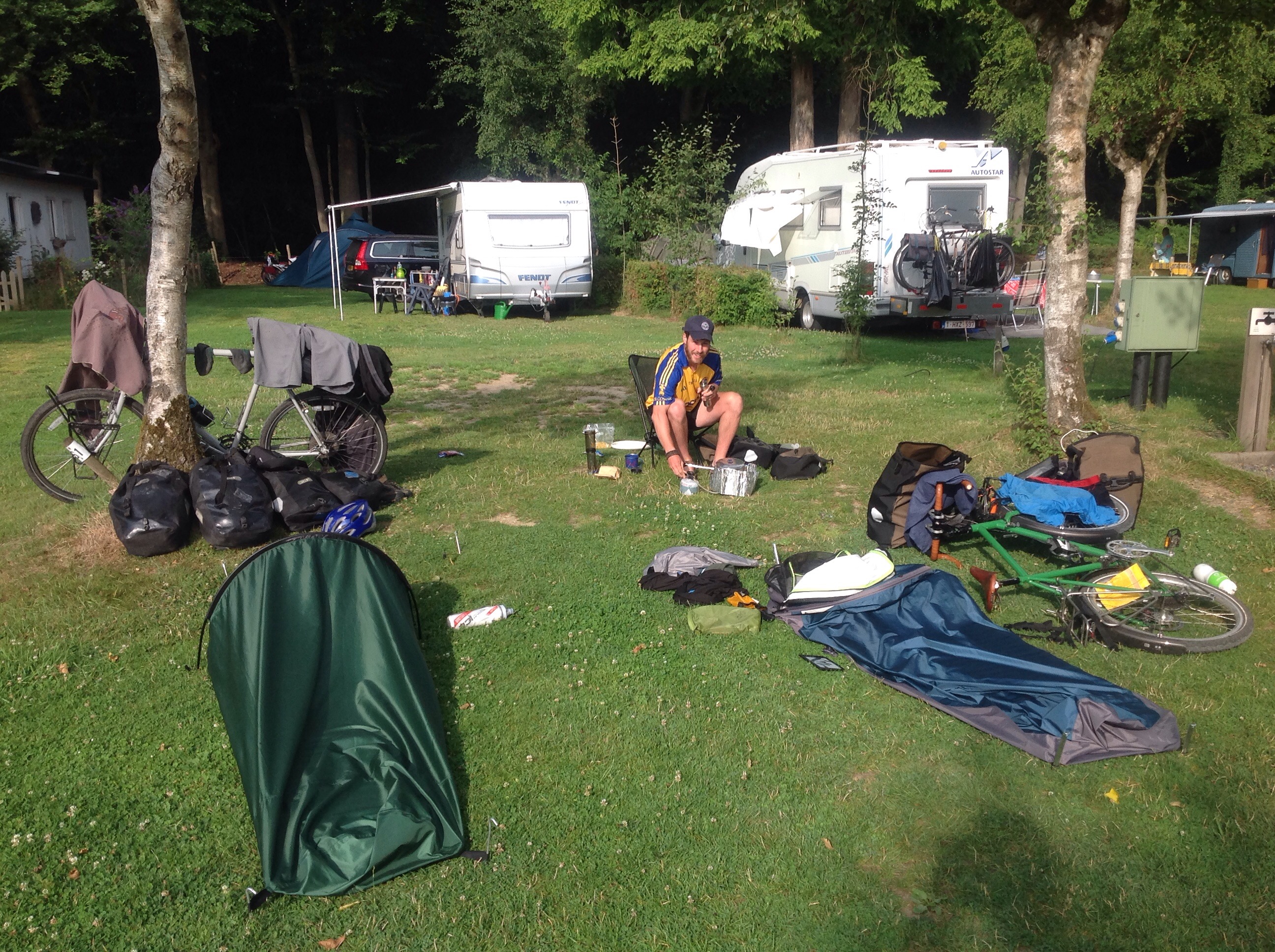 We spent a bit of time looking for somewhere to camp, but couldn’t find anywhere discrete, and asking around if we could sleep in someone’s field led nowhere as the land was all own by “the chateaux”, so eventually, reluctantly, we ended the day in our first campsite.