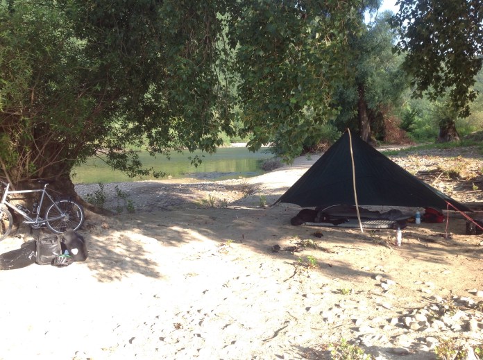 As it got later we started keeping an eye out for places to set up for the night. There seemed to not be many potential spots to camp, all the land was either cultivated, someone’s house or a steep hill. As we pushed on into the evening though, we spotted small islands and peninsulas near the shore, silt deposits from the river that had built up. We finally found one that we were able to roll our bikes out too and set up for the night.