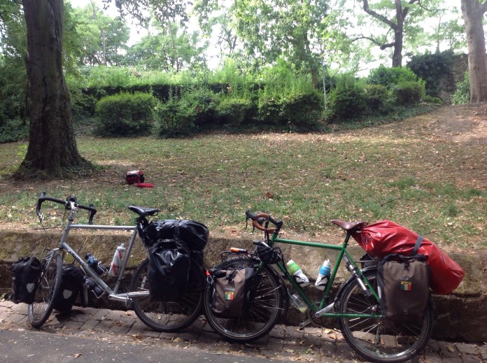 The next morning we slowly, gently, delicately got up and packed up over an hour or so. We both still felt pretty bad, we had no drinking water. The next town, Bingen, was only three km away. We could see it downriver from where we had camped. So we made probably the most difficult journey of the trip so far: both feeling terrible, dehydrated and exhausted we hauled out bikes back to the cycle path and rode gently into Bingen.