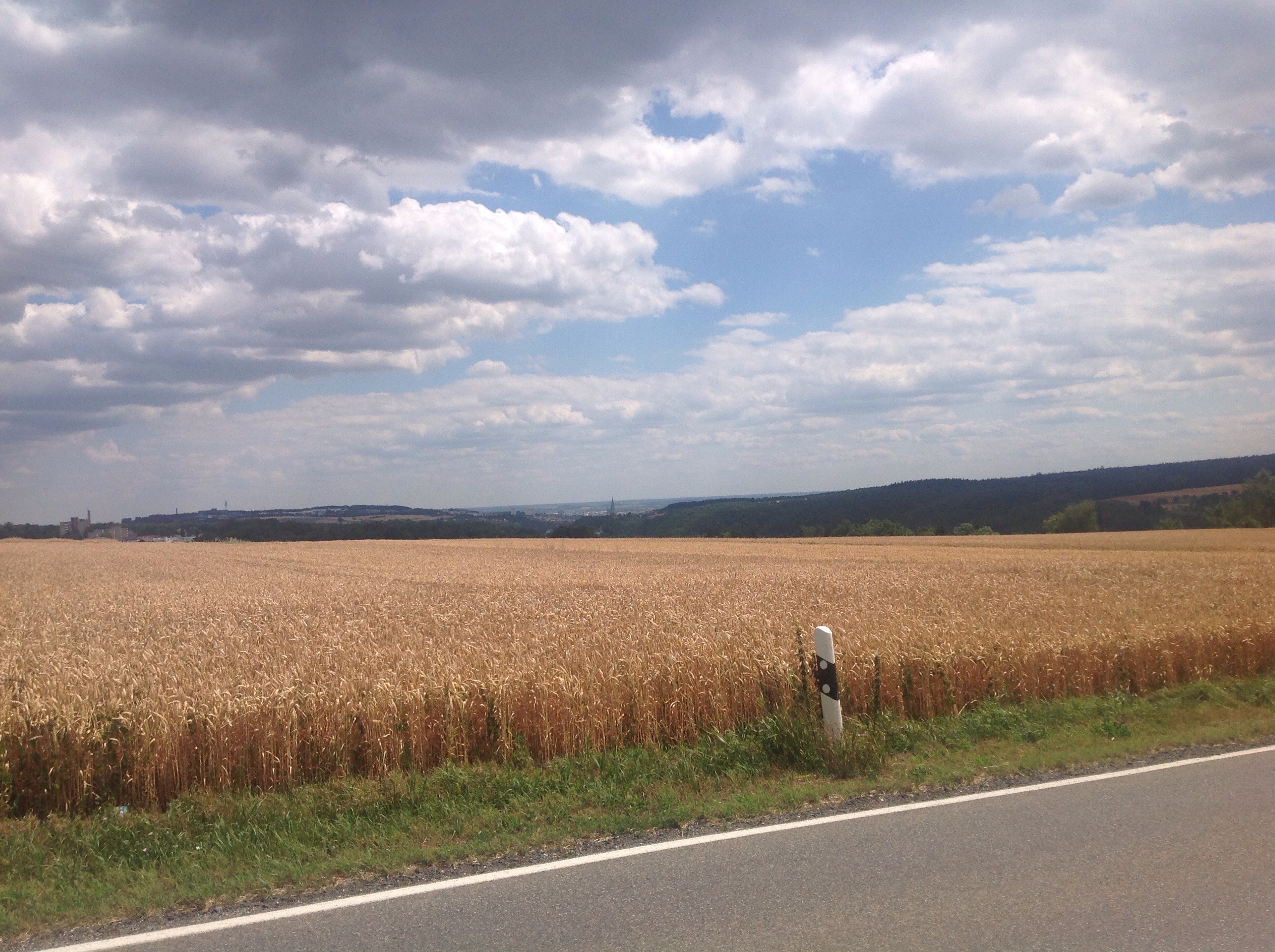 From here we found the cycle network again and followed it a while, up over hills and along the edges of farmland and forest. There was a nice rhythm to the day, climbing up a hill, seeing a small village or town in the distance with the church spire at the centre and then descending down into the settlement, only to repeat the pattern again.