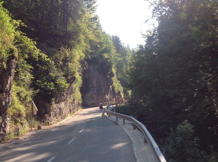 We left from our little spot under the bridge about nine the next morning. We rode for a short time along farmland and then started to climb uphill in a gorge. The road seemed to cling to the rock face while the river flowed by at pace beside us.