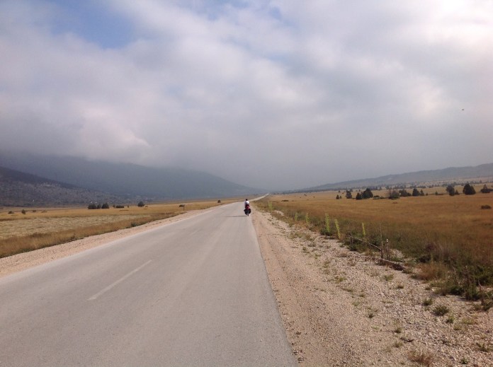 We set off form the lake out along the plateau, it was, so far p, the most isolated place we had ridden through. Very few houses around, and the dark clouds blowing in over the mountains probably added to the feeling. After a while we saw someone sat down on the side of the road. It was a hitchhiker, a guy from the Czech Republic by the name of Felix, though how he had gotten all the way out here we didn’t know, no cars had passed us all morning.