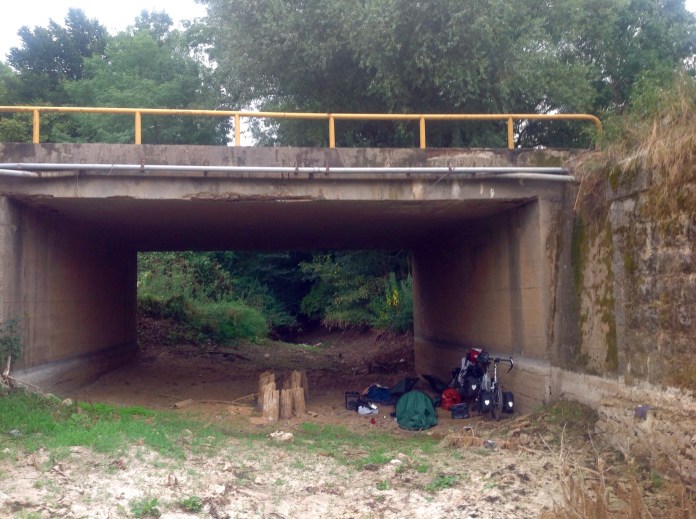 It was starting to get dark so we were on the lookout for campsites. Crossing a small bridge we saw that the stream in crossed had long dried up. It had been threatening to rain all day, so the prospect of some solid shelter sealed the deal and we wheeled down under the bridge. That night it did rain hard, and the solid concrete held up very well.