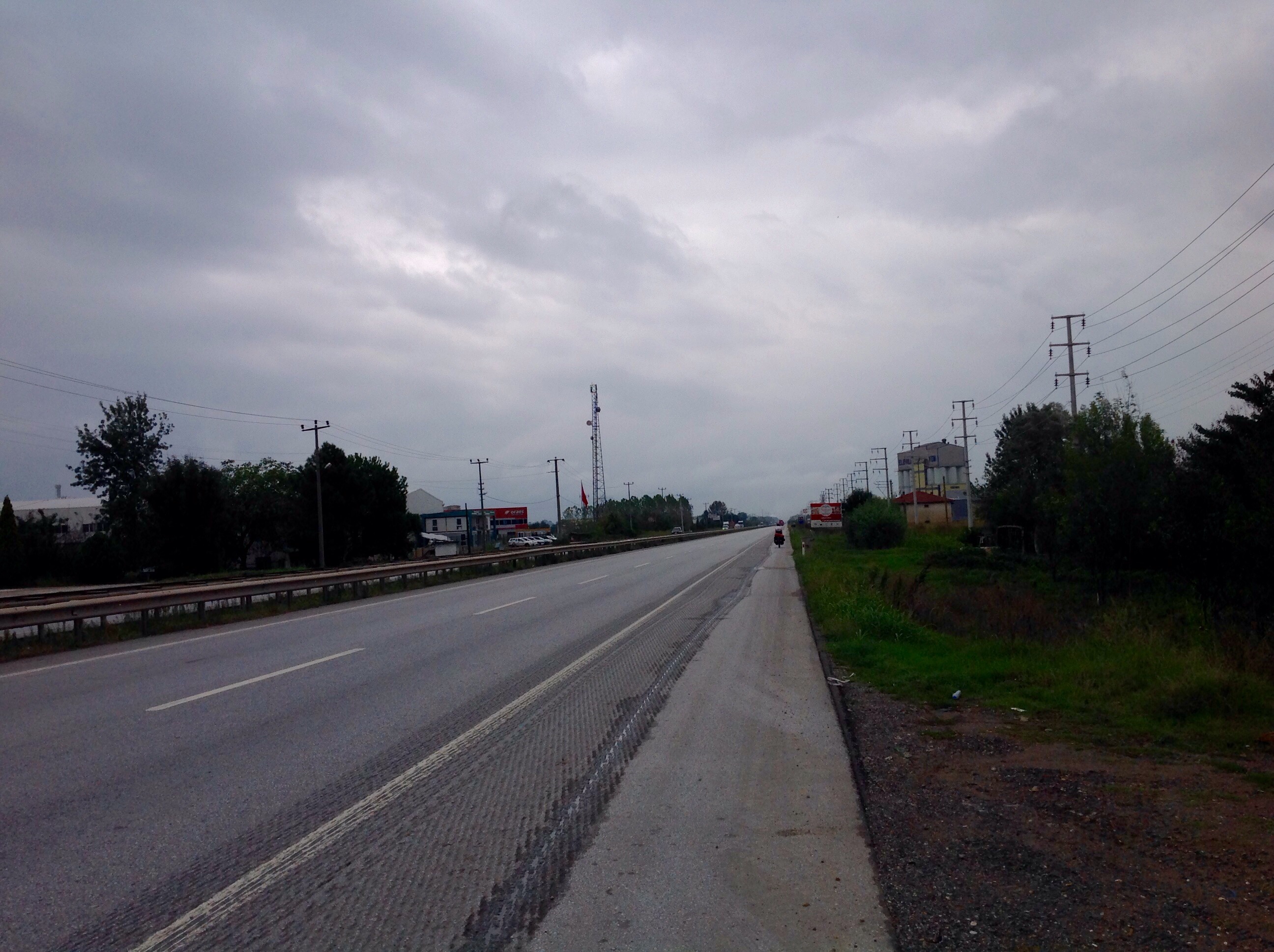 We were back on the D100 and from our campsite to the turn off for the smaller road to Ankara was a total straight shot. There was a light rain, but also a tailwind so it kind of balanced out that way. We made the turn off onto the route D140 and, what a relief, the traffic calmed almost immediately. By by now both of us were feeling pretty hungry so we stopped at the next spot that had food, a lot next to the road with a grocer and a bakery.