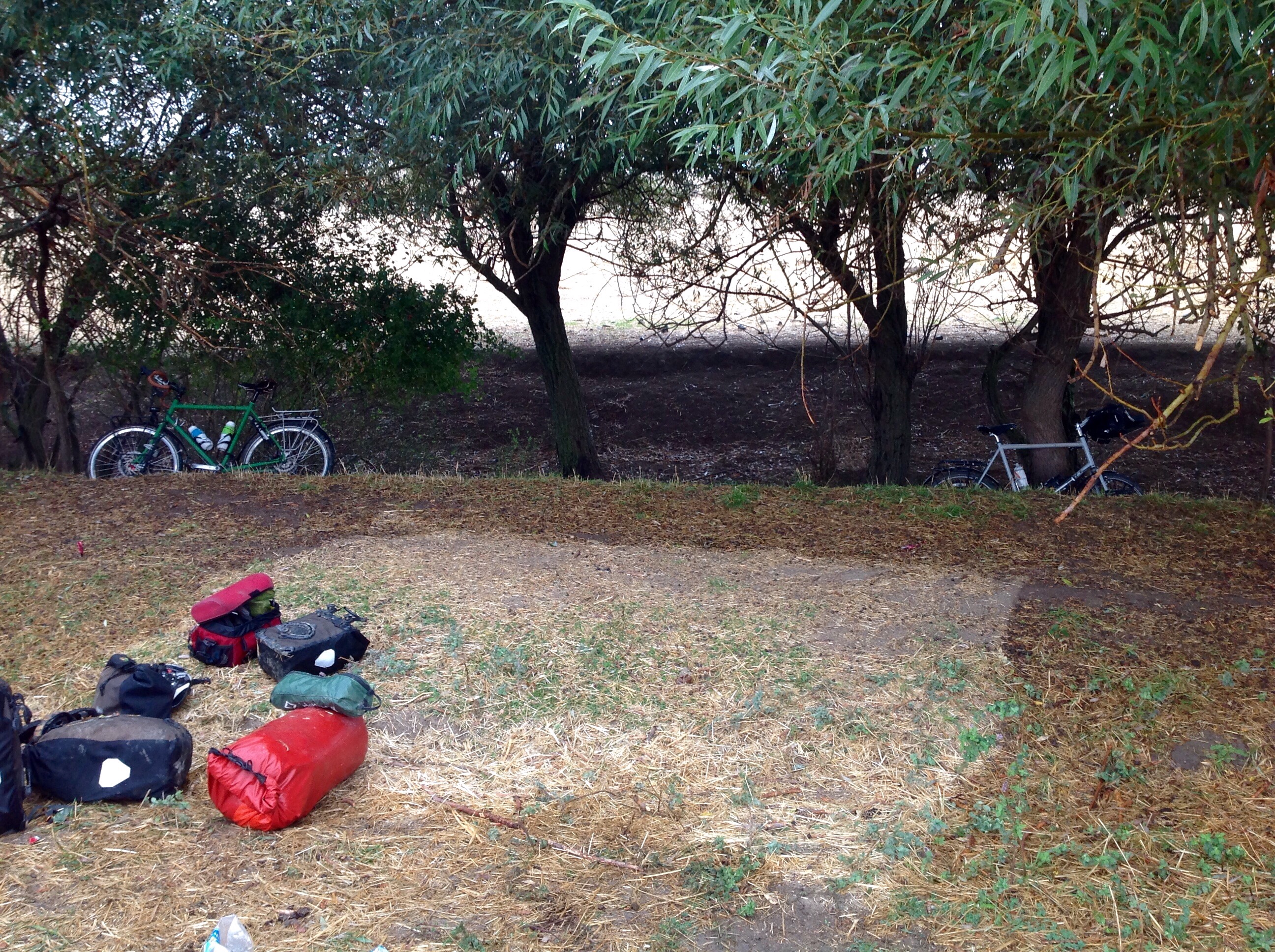 We were quite high up now and there were few trees or bushes. There had been dark clouds on the horizon all day,and we had been fortunate enough to stay out of them but with darkness closing in it was time to find somewhere somewhat sheltered to camp for when they arrived as they were surely blowing our way. We found a stand of trees growing by an irrigation ditch just off the road.