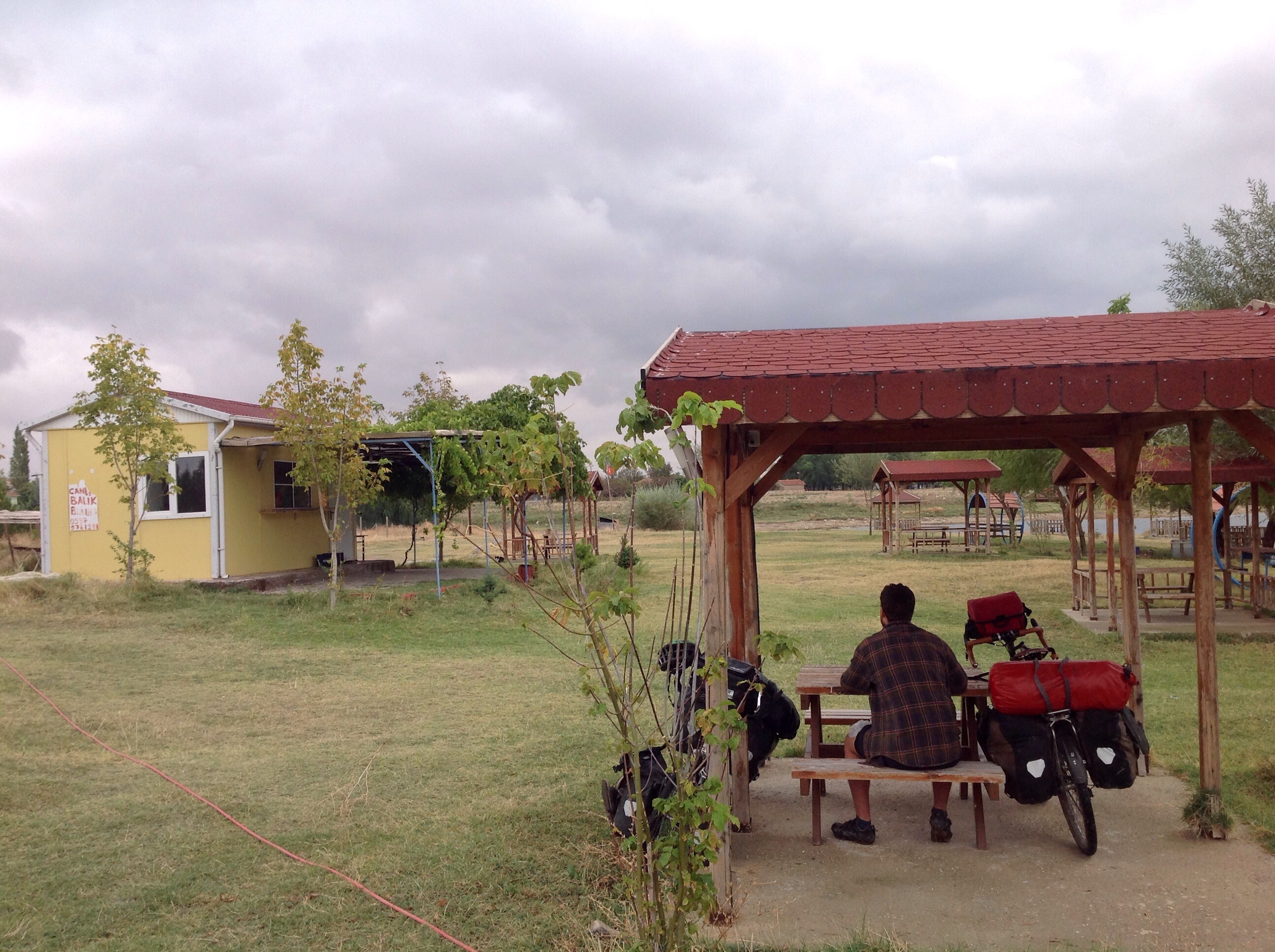 So it was maybe 90 minutes that we arrived in Kirsehir after this encounter. Kirsehir was surprisingly big with a busy high street where we picked up some dinner. We then cycled a short way out of town and found a petrol station with a nice grassy area to camp at and called it a day.