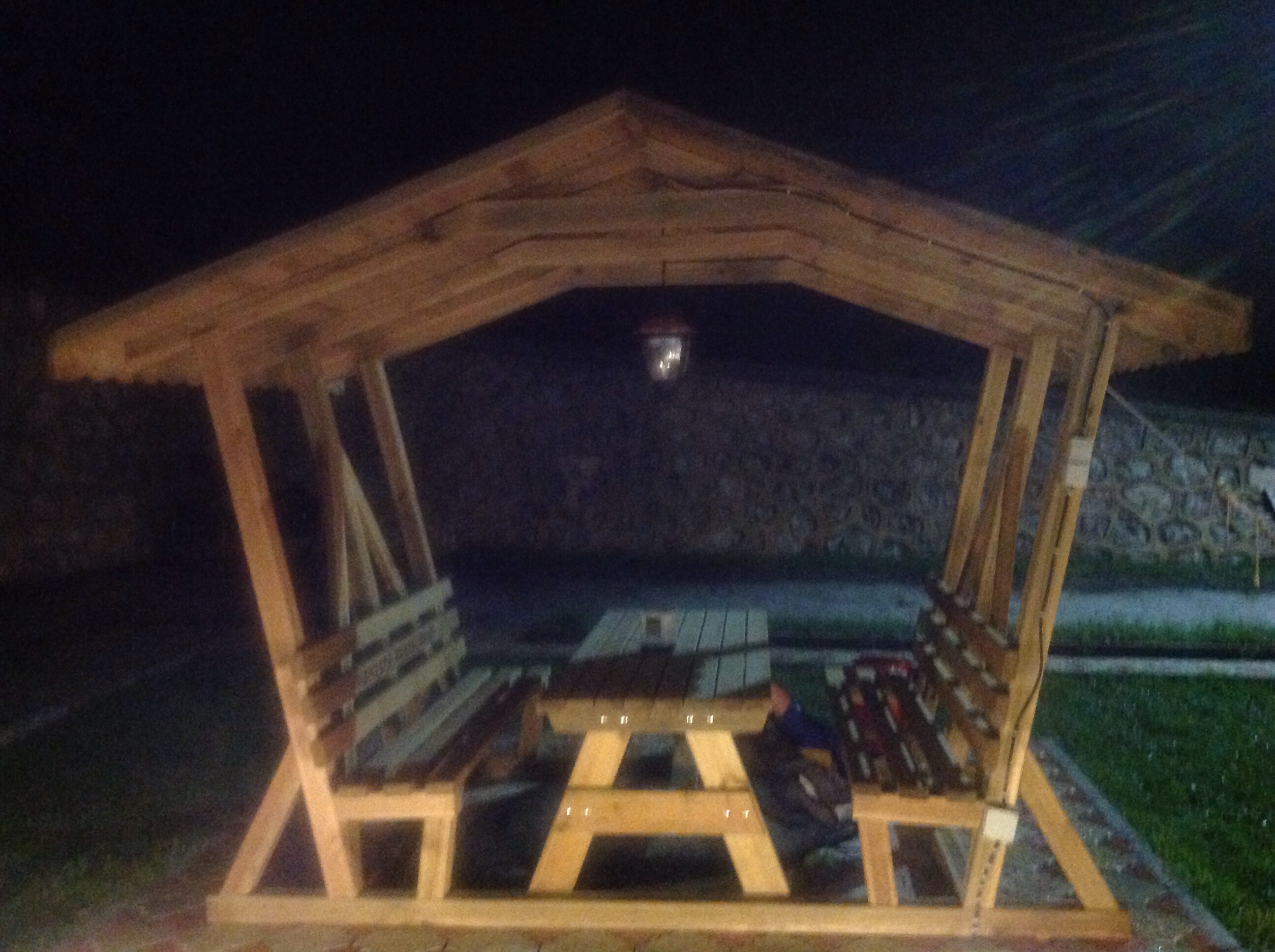 We wound up riding into the evening and the dark, it wasn’t an issue with the road being really well lit but it did catch us off guard a bit, with winter coming on night has been setting in earlier and earlier. At the top of another climb we at last came across somewhere to camp, a BP petrol station, attached to the station was a restaurant with a grassy area behind it. The manager of the restaurant gave is the ok to camp around back. We decided to sleep under the small gazebo that punctuated the lot what with the misty rain that had started coming down.
