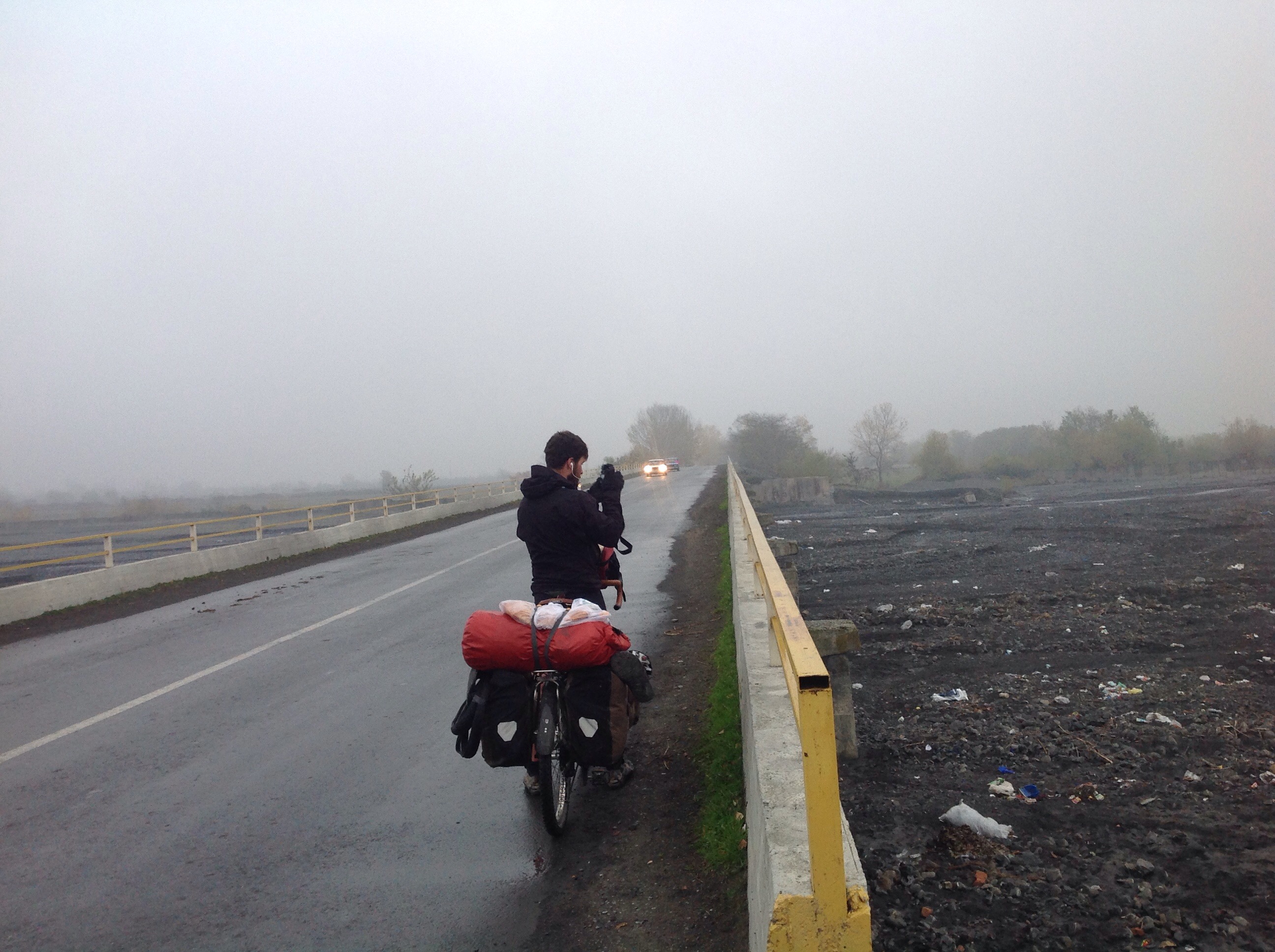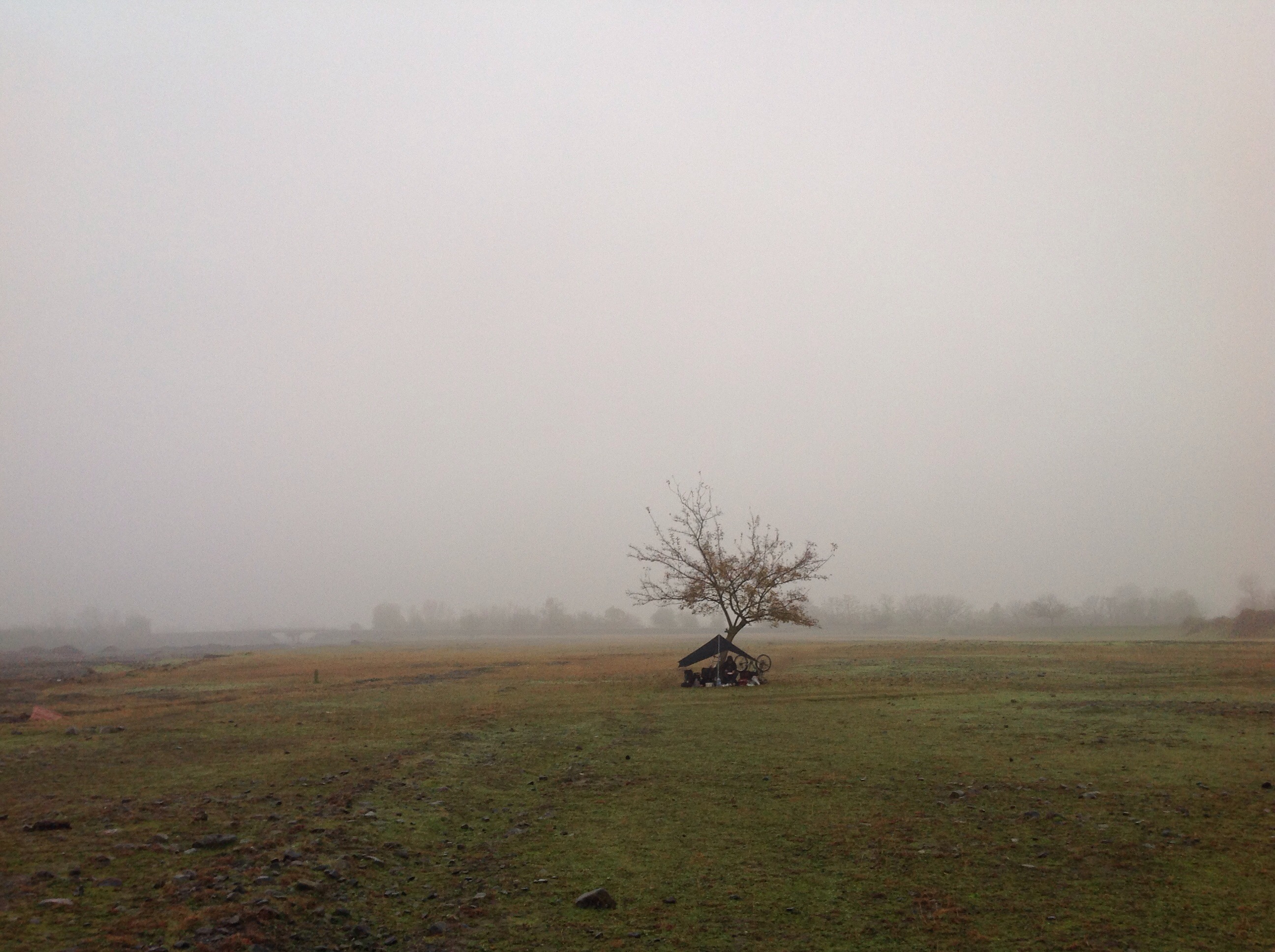 After the shop we found a nice camp spot in a wide flat flood plain next to a river. We walked a while away from the road and in our own little bubble of fog we set up by a solitary tree and settled down to our first night in Azerbaijan.