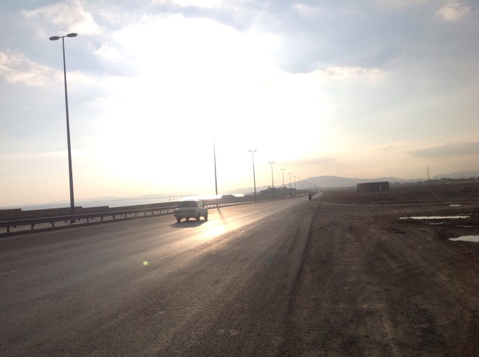 After a couple of days in Baku we left and started to ride South to the Iranian border. It was a long flat road and quite windy so we camped outside the city in an abandoned hut.