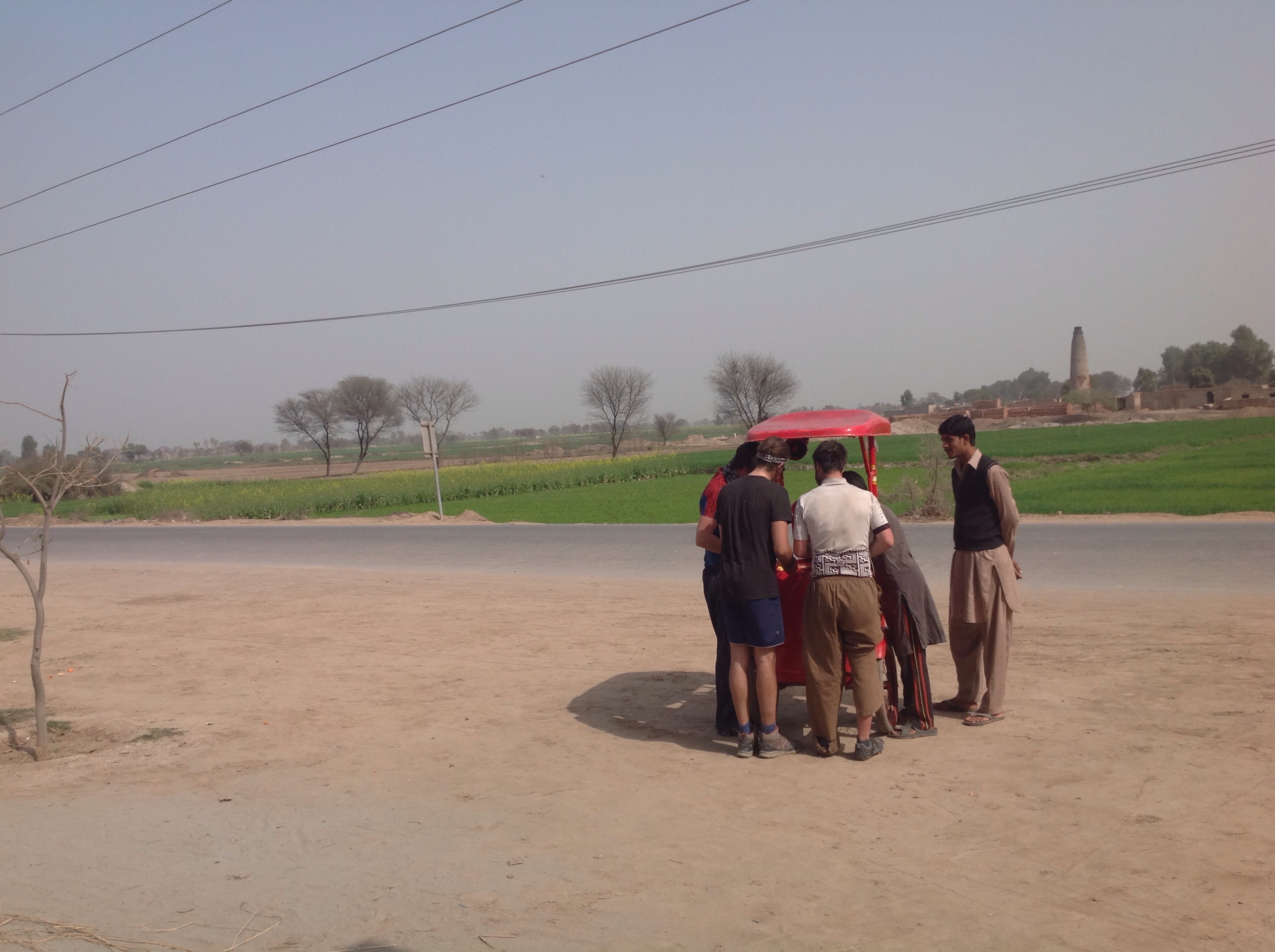 So it really felt now that we were cycling in Pakistan and not simply though it. In the early afternoon we passed through another village and out the other side in a clear field next to the road was a big group of people all watching a drum performance. We decided to stop and take a look and right away a man came up and spoke to us. He asked, do you want to see the drumming? Sure we said, and led us through the circle of people where we were the cause of more attention than the drummers themselves.