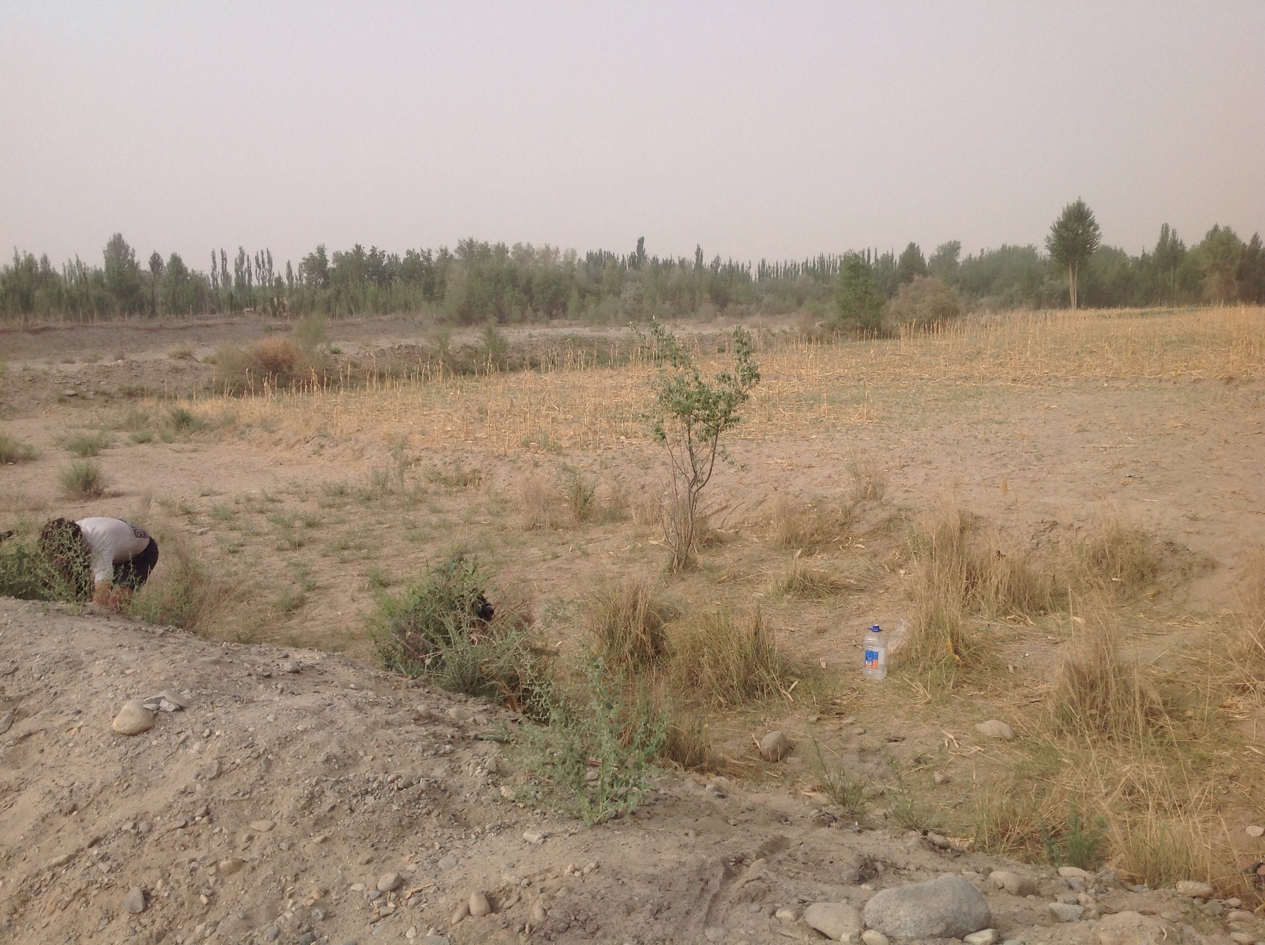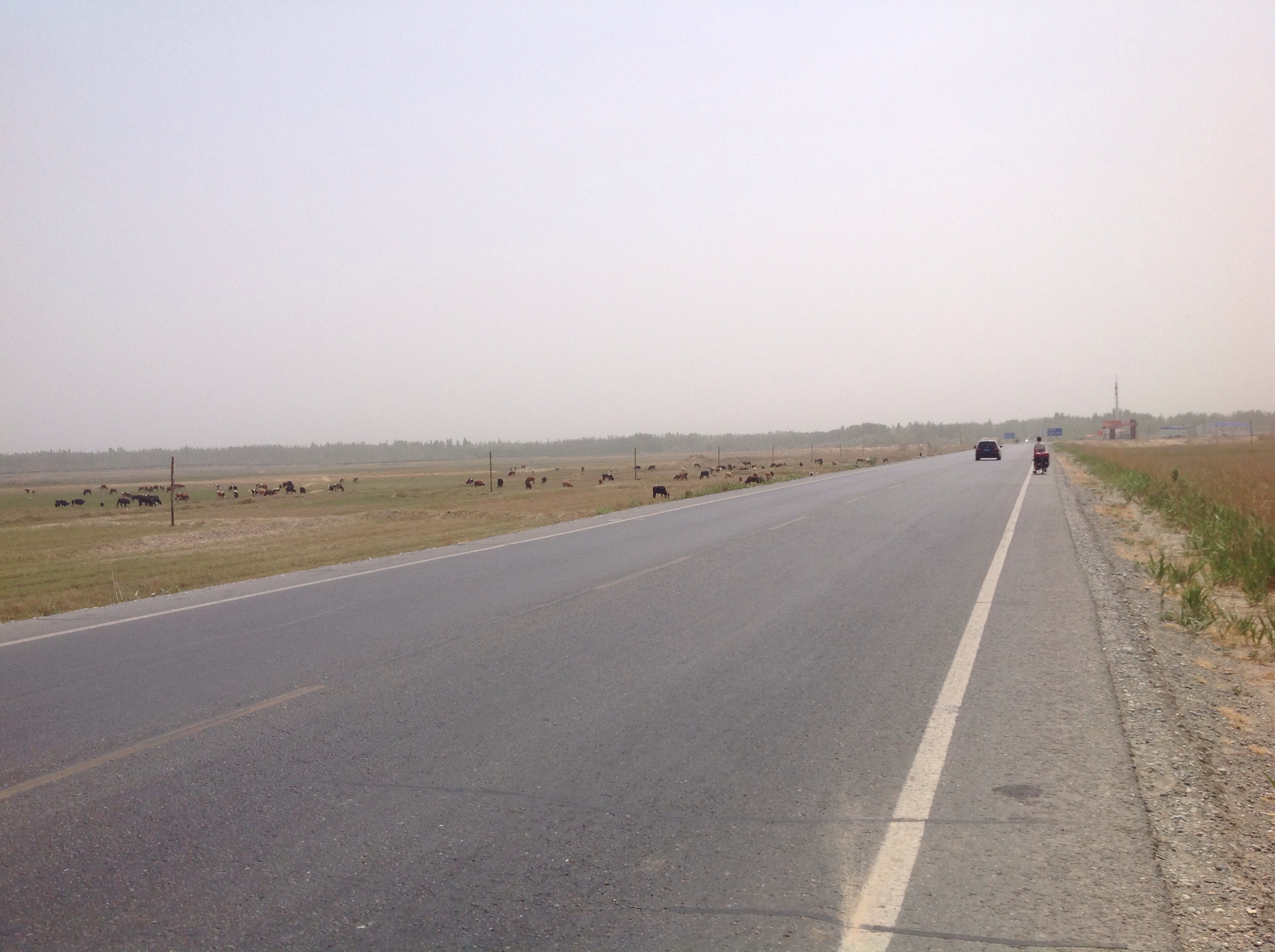 After lunch and out the other side of Keriya the desert returned again, dusty and sandy as ever. The road was straight and flat and there wasn’t much to see all around. A haze hung on the horizon. Off in the distance a line of trees indicated a welcome change of scenery. But soon we couldn’t see the trees, even thought we had gotten closer. They were swallowed up in the haze, which was moving towards us.