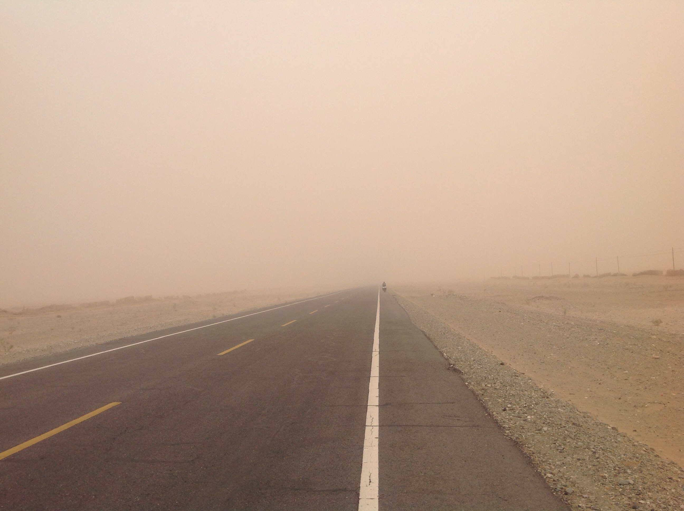 It wasn’t haze, it was a sandstorm barreling down on us. The wind hit then the sand, we donned sunglasses and buffs to cover our face as the wind blew right into us and the sand streamed around. The sand only lasted about ten or so minutes mercifully, but the headwind continued and the dusty haze stuck around to limit visibility to about 2km.