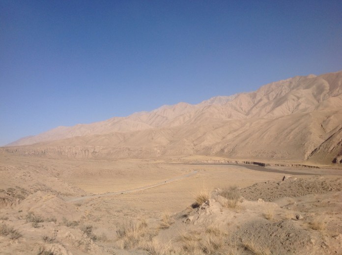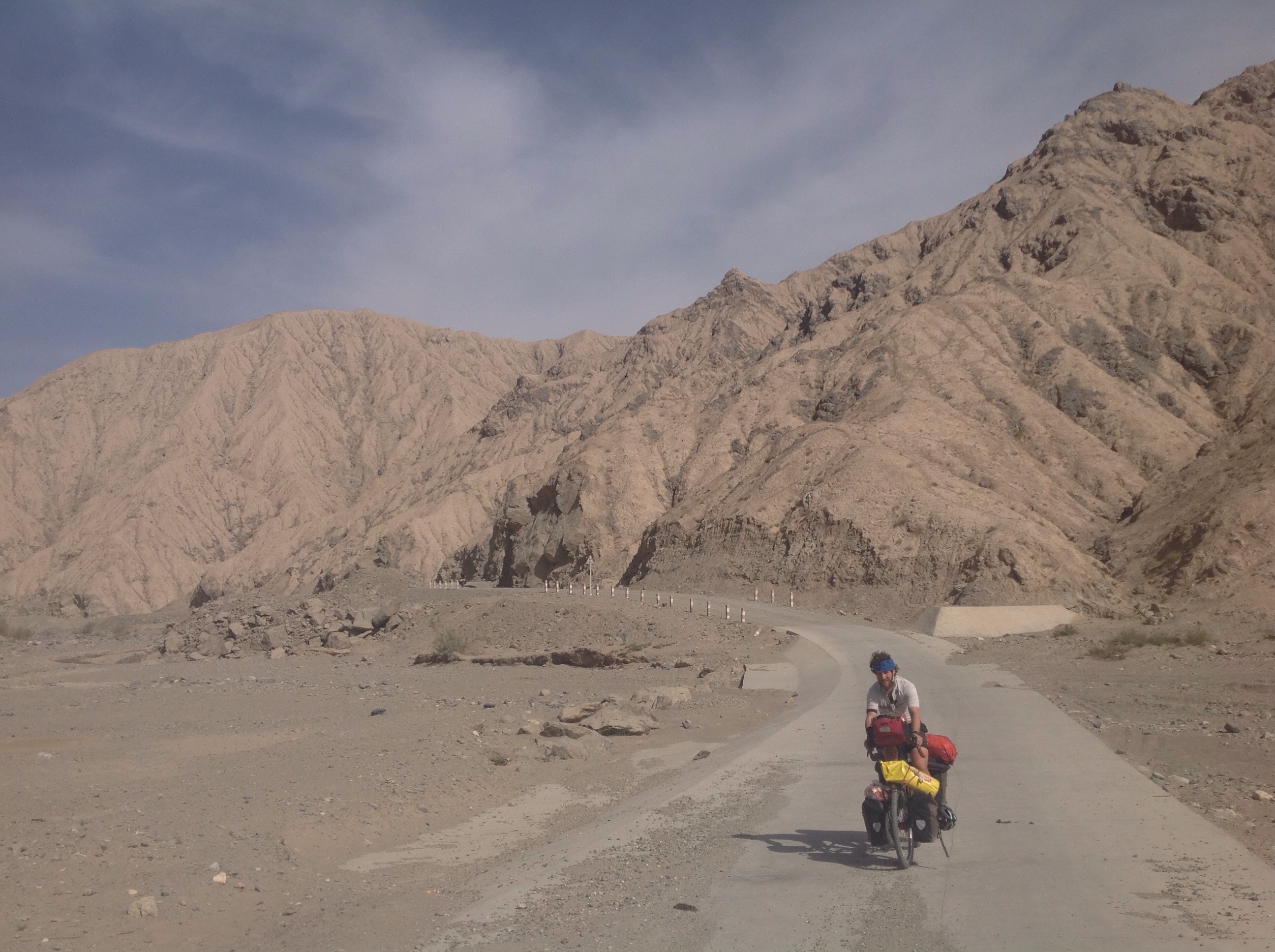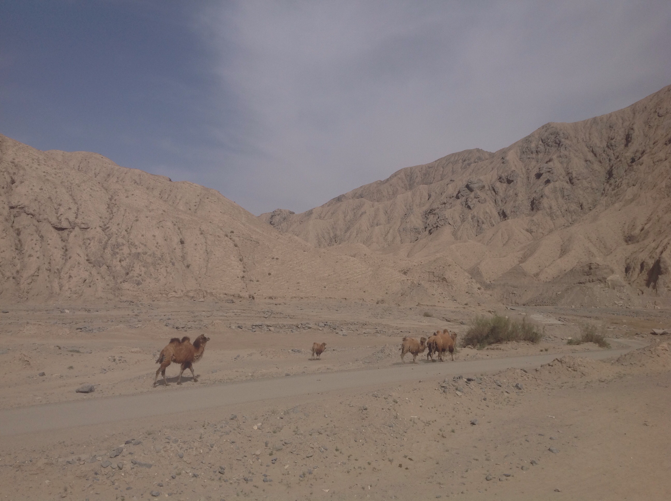 We got on the road early and started climbing. Soon the foothills closed in around us and camels trotted up and down the peaks. We crossed a wide river basin, completely dry, and on the other side sat a small hut with a barrier over the road. We ducked under the barrier and cycled swiftly on. With that obstacle out of the way we were feeling good, and that was only compounded by the realisation that we were now in a river valley at the start of the Kunlun mountains, there were things to look at, the road changed direction and gradient frequently – it was so much better than the dull, dreary desert riding we had been putting up with so far.