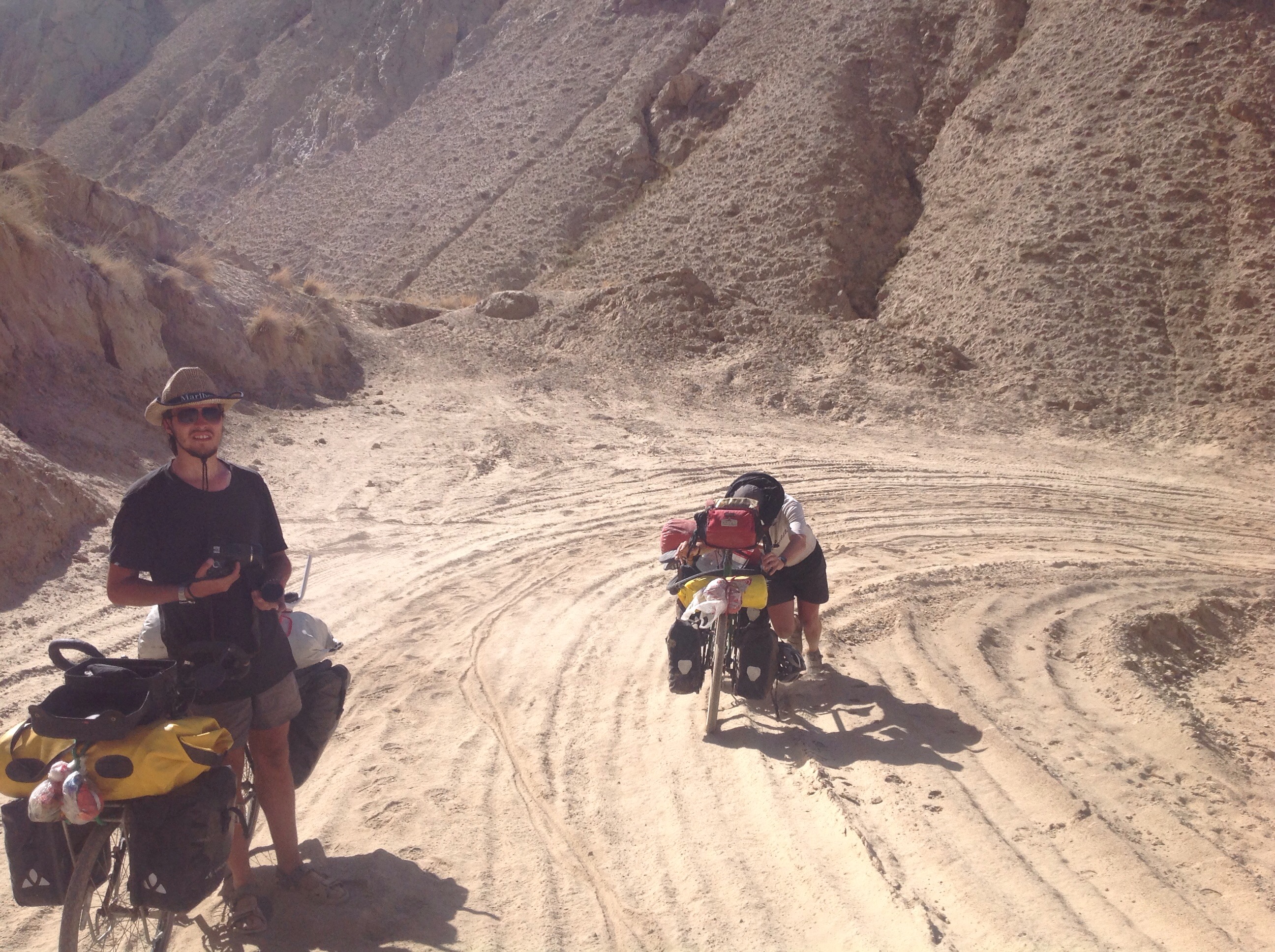 This pass would have been tough enough on good road with a normal load, but the road had long since deteriorated into gravel and sand and we were carrying an extra 10 kilograms at least. After a couple of attempts at cycling we all arrived at the same conclusion: there was no choice but to push the bikes over the pass. Pushing loaded bikes uphill is in no way easier than riding them, in fact it’s probably more difficult. It took over an hour to get to the top, hauling the bikes through thick sand and around steep turns.