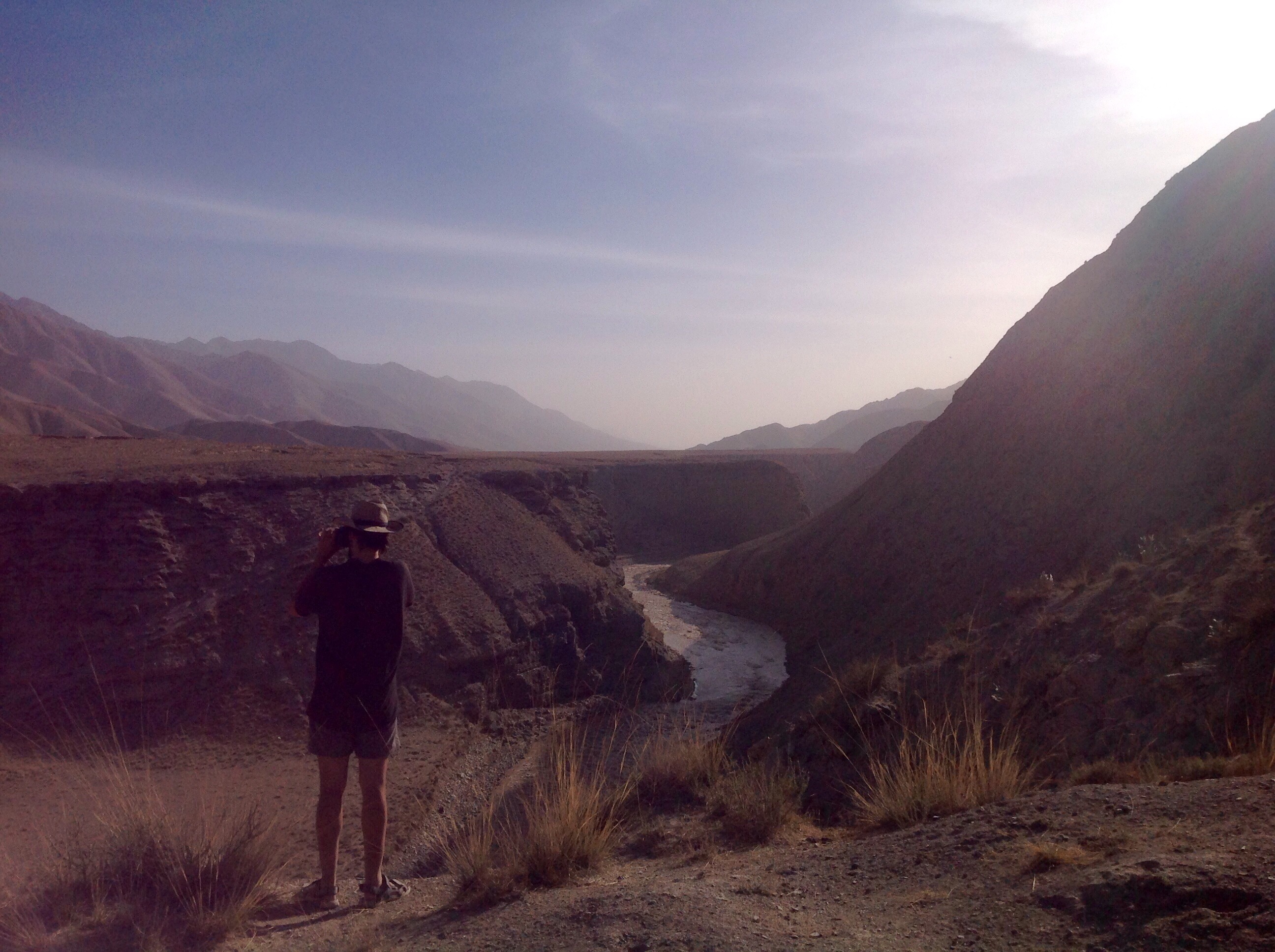 A short descent after the pass and then another steep climb after that. Once over that peak though the view opened up and we found ourself in a wide open valley with a big, fast flowing river cutting through it. In my me memory this vista was a lush meadow filled with plant life. Looking back on the photos it still looks like a desert though, so I suppose the sight of a big, fast flowing river must have tinted my view.