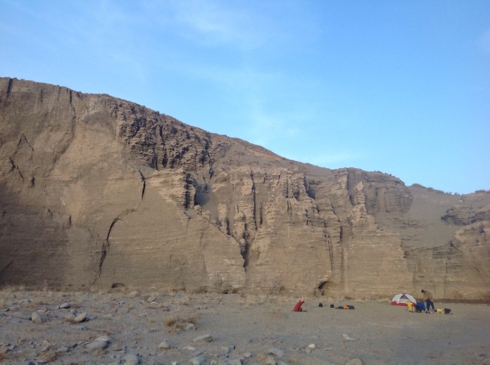 It was late in the day now, we cycled for another half and hour along the banks of the river. At a wide meander we found a large sandy beach opposite a sheer cliff where we set up camp.
