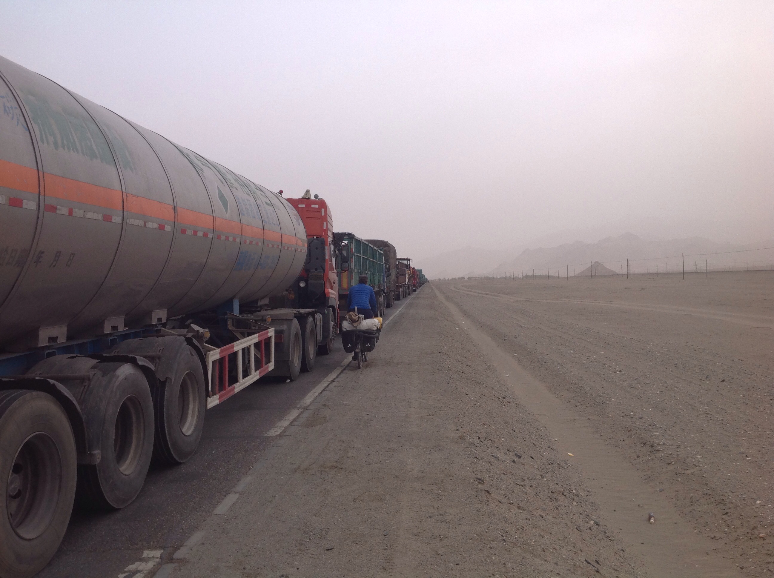 Before too long we arrived at the first police checkpoint. We knew it was coming up long before we saw any trace of a building by the long backup of trucks that snaked along the road for a good 5 kilometres before the checkpoint. We were a little bit nervous approaching the checkpoint, some cyclists have reported no being let through as the police think they’re going to try sneaking into Tibet. We had our map with our rout to Yushu, the next big city well to the east of Tibet at the end of the route S308: a road that travels generally East-West across Qinghai province towards Sichuan province. Along with a hotel booking in Yushu we had made (booking.com, free booking free cancellation) we felt we could prove we weren’t heading to Tibet if it came to it.