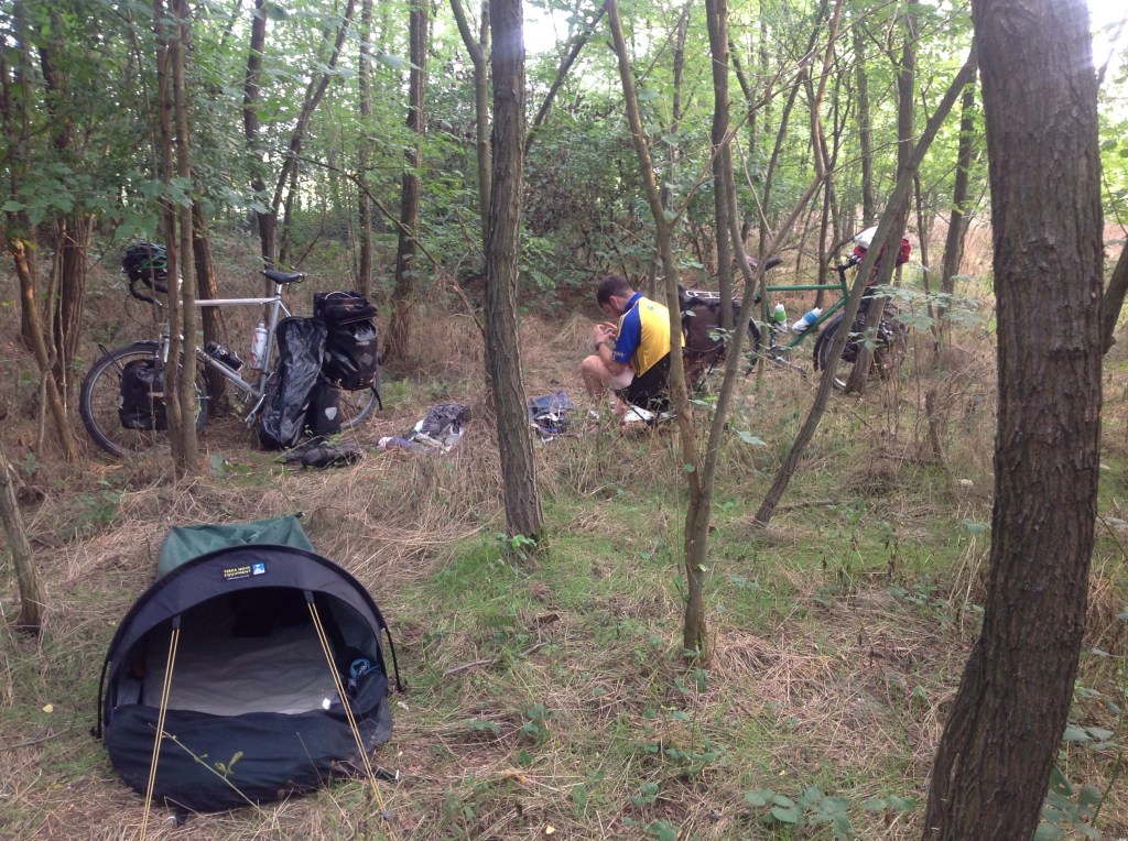 We were only 25 km from the city now, but it was evening and we wanted to find somewhere nearby to camp so that we could roll in in the morning to get more time in the city. After looking for a spot to camp at for a while we finally found an abandoned lot next to the road where we could camp out of sight of the cars for the night.