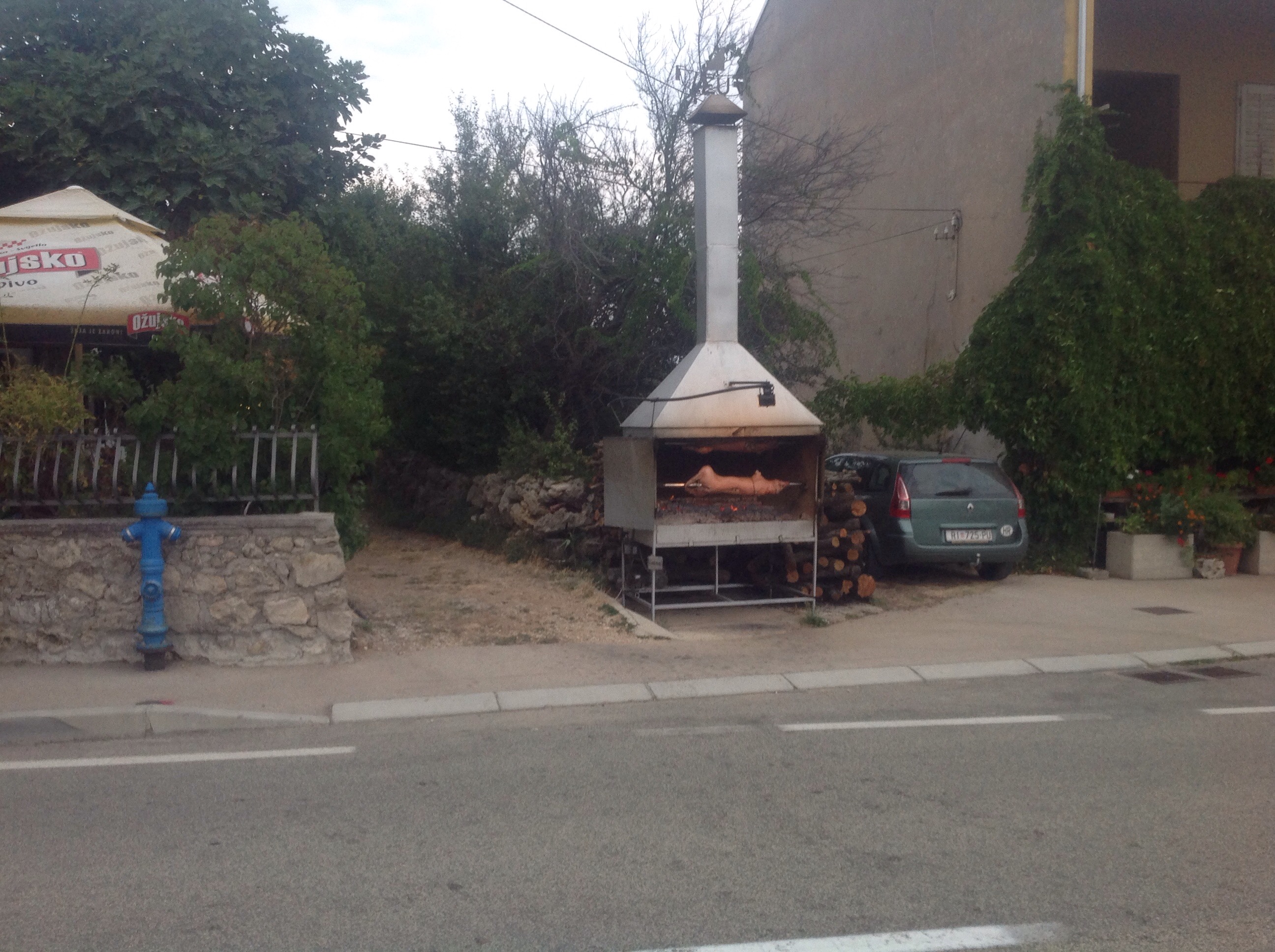 The plan was to keep riding until a bit before Osor and camp, however around dinner time we passed a small restaurant on the side of the road cooking pig on a spit. It looked so good we had to stop. It was delicious, and cheap too now that we had left the tourist hotspot of the island behind.