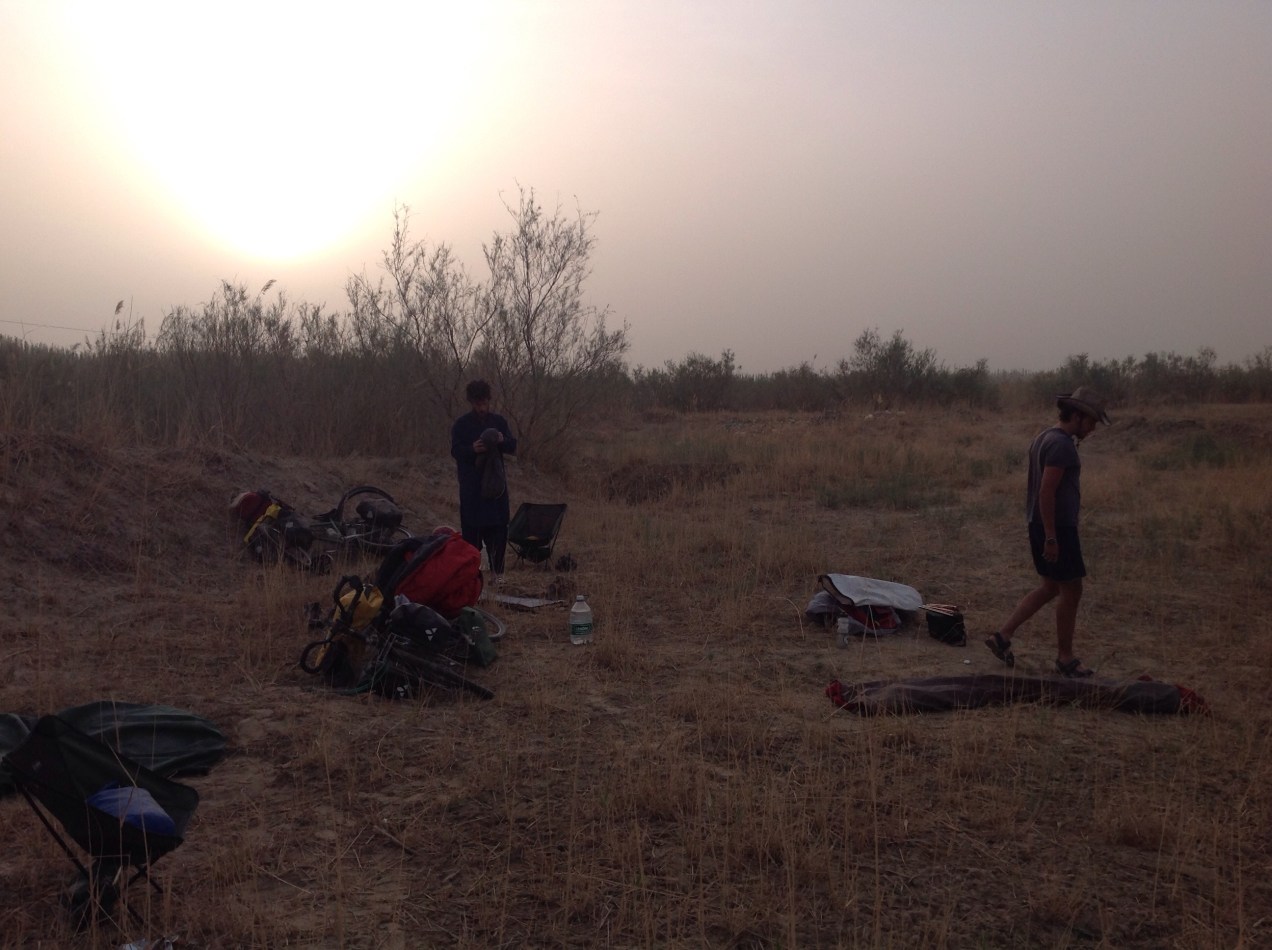 We passed a small checkpost as evening closed in filling up our water and then walking our bikes out to one of the barren fields next to the road. A raised earthen barrier, designed to protect the crops from the wind when the field was fertile provided us with some rudimentary shelter from the wind that night which howled until the early morining.