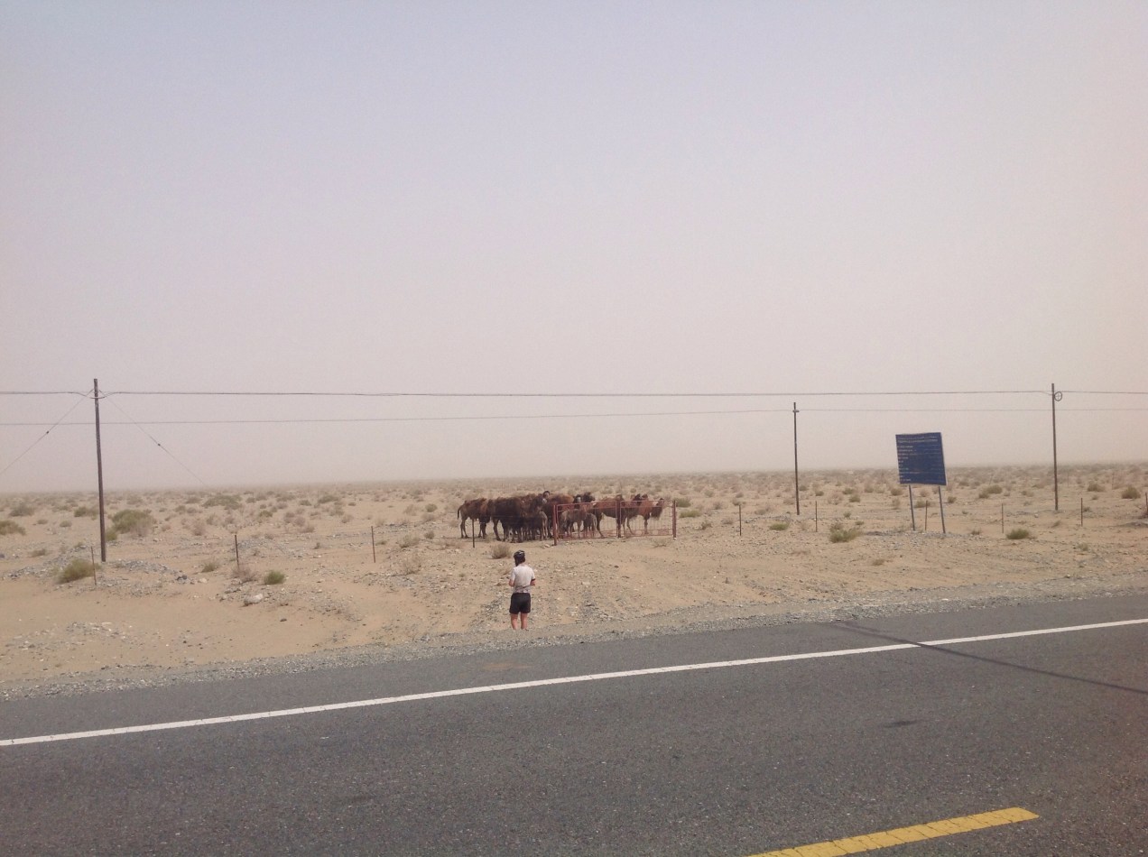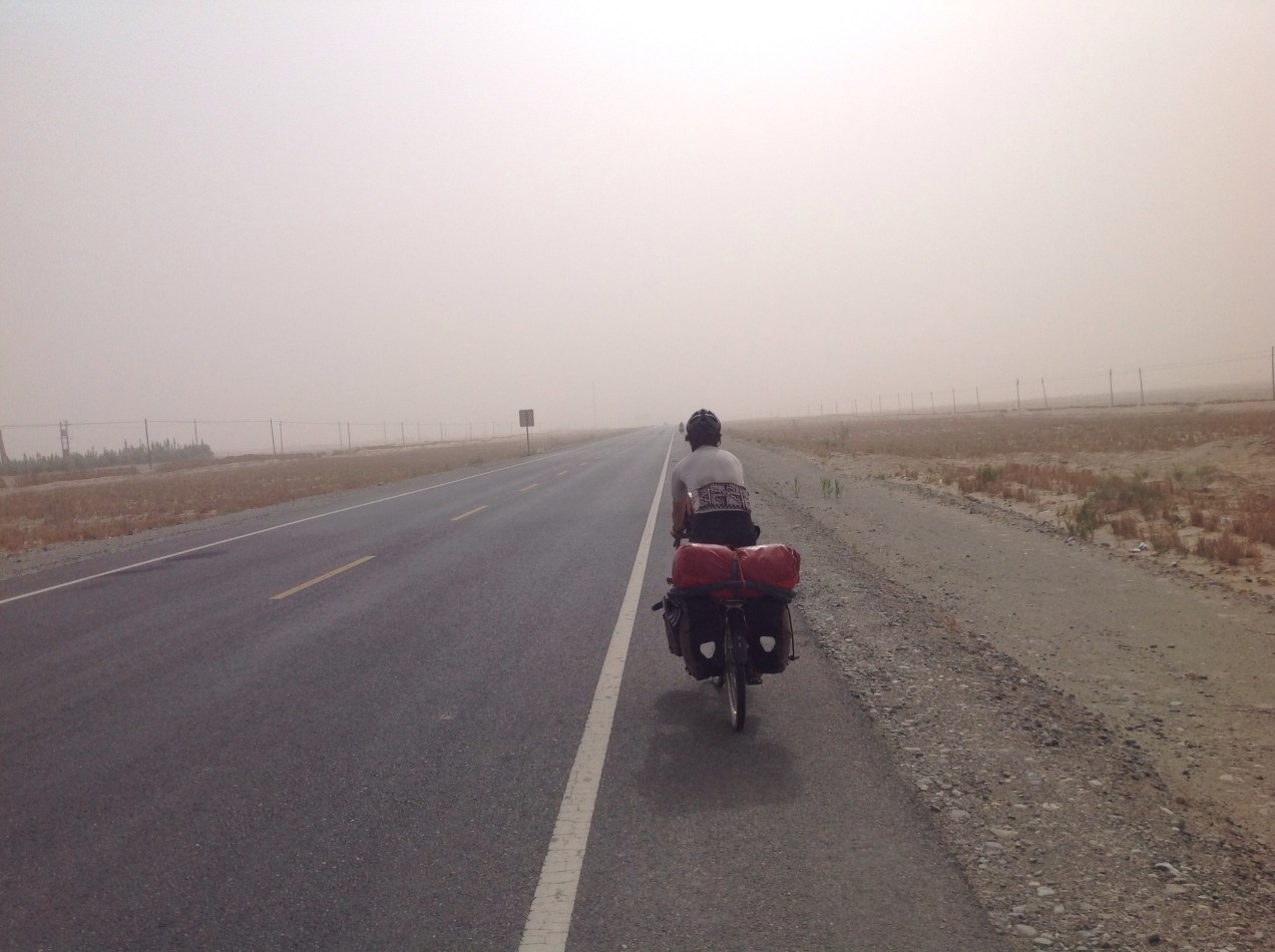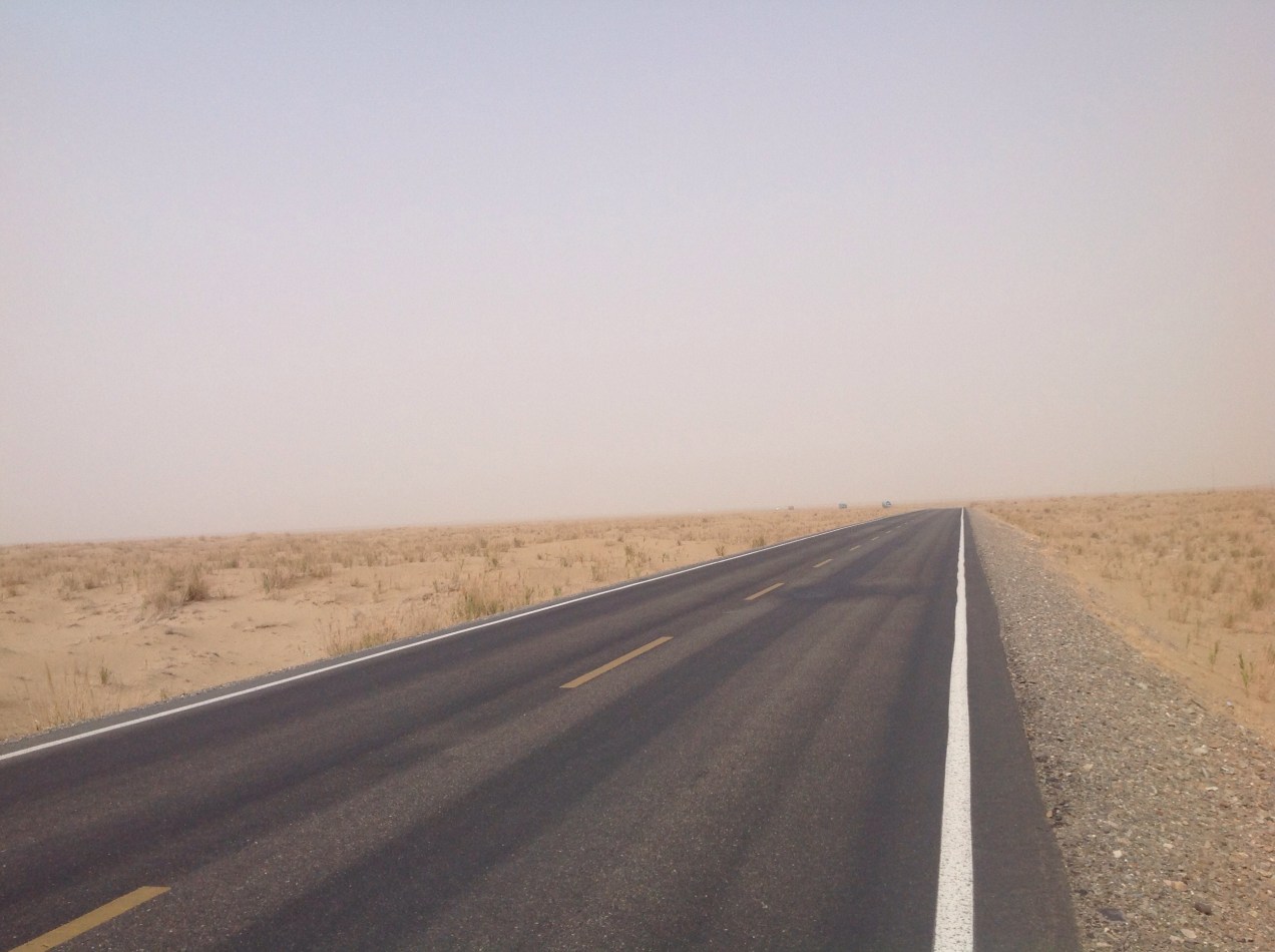 After lunch and out the other side of Keriya the desert returned again, dusty and sandy as ever. The road was straight and flat and there wasn’t much to see all around. A haze hung on the horizon. Off in the distance a line of trees indicated a welcome change of scenery. But soon we couldn’t see the trees, even thought we had gotten closer. They were swallowed up in the haze, which was moving towards us.