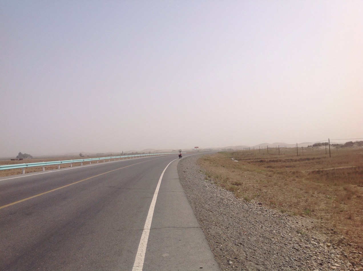It wasn’t haze, it was a sandstorm barreling down on us. The wind hit then the sand, we donned sunglasses and buffs to cover our face as the wind blew right into us and the sand streamed around. The sand only lasted about ten or so minutes mercifully, but the headwind continued and the dusty haze stuck around to limit visibility to about 2km.