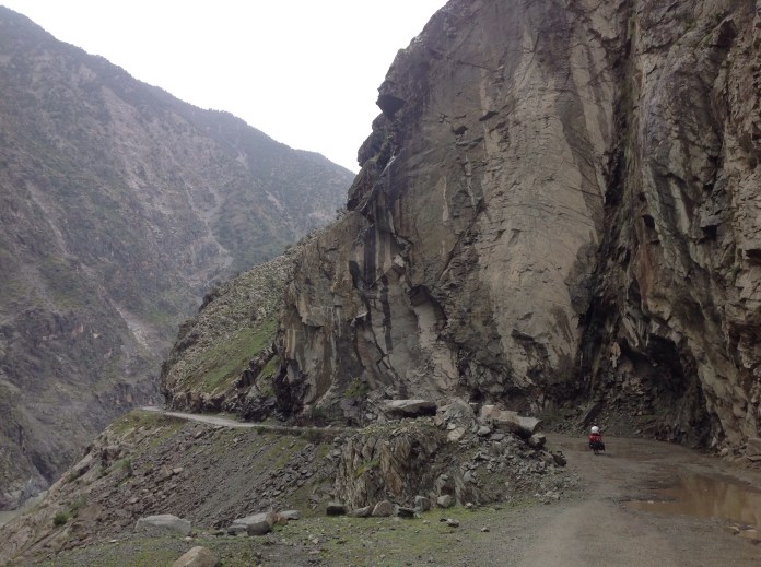 We were dropped in the wide parking area in front of the Badakshan hotel, a serviceable place and one of the few that has survived the collapsed of the tourism industry in Pakistan since 9/11. The manager came out to greet us but we weren’t staying tonight, we wanted to get started cycling right away. He warned us of a rockslide about 10km out of town but we were prepared for it by now and were ready to carry our stuff over the rocks of needs be.