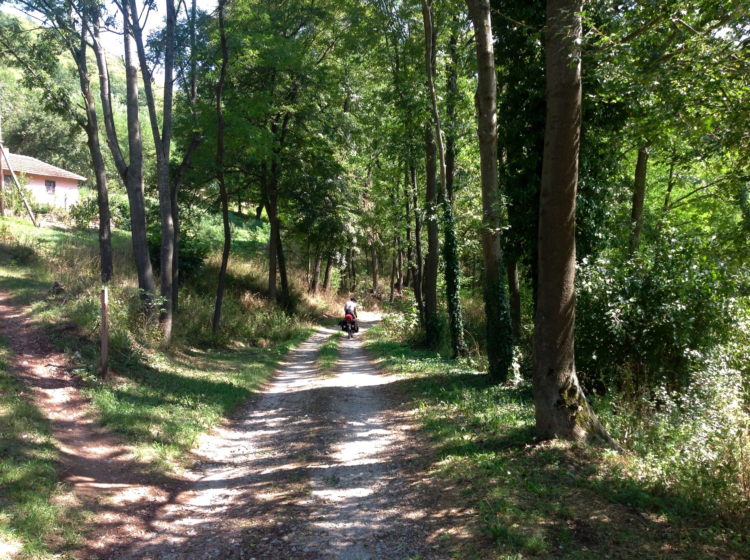 Interesting was one way to describe it, challenging probably another. We cycled along for a couple of kilometres, and the road then turned to a gravel track, which turned into a rocky strip and then finally a rocky and muddy trail, all going uphill. It was a fun ride, looking back on it, and it was utterly quiet the whole way, we passed only a smattering of dwellings and no tractors or motorbikes (the only motor vehicles that could probably navigate this track).