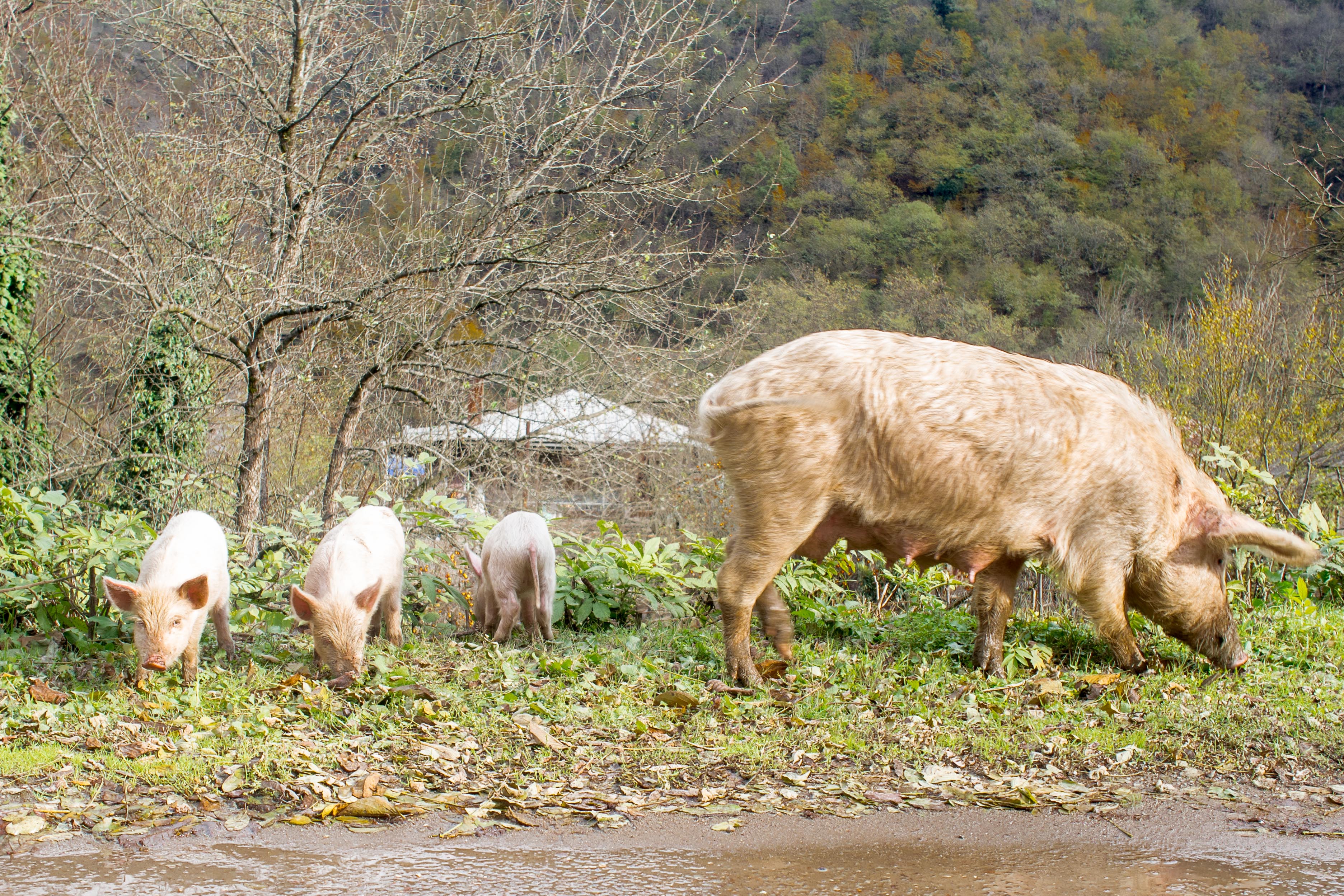 Family of pigs on the side of the road