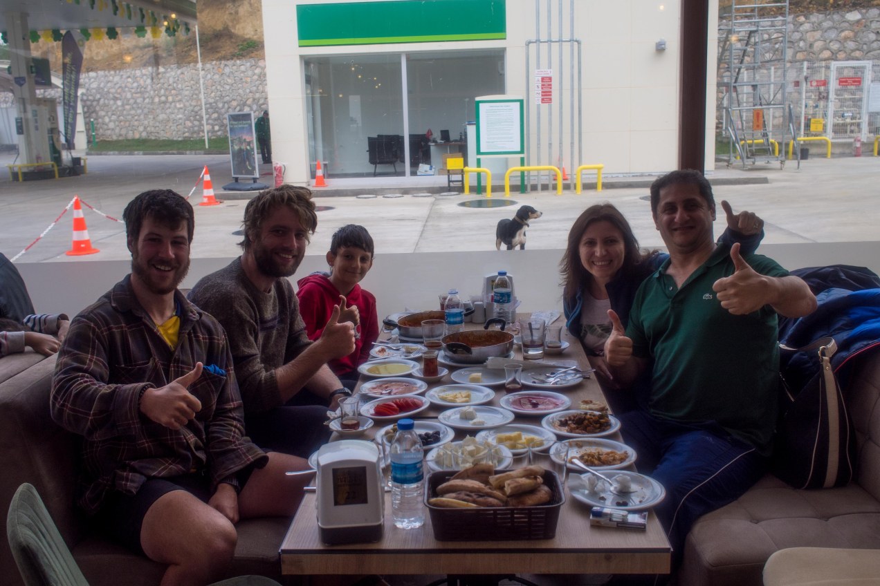 After cycling late into the night and not coming across anywhere to camp, we found a filling station and camped in the picnic area of the restaurant. The next morning we we’re getting up and everyone was staring at us from inside the restaurant. We we’re grumpy and cold and not in the mood to be stared at. Next a boy and a waiter come out and the boy says his family( the people who had been staring at us) wanted us to come in and have breakfast with them. We accepted their very generous offer and were treated to a huge breakfast. The family were going on holidays to the black sea from Istanbul and we had a great time chatting with them.