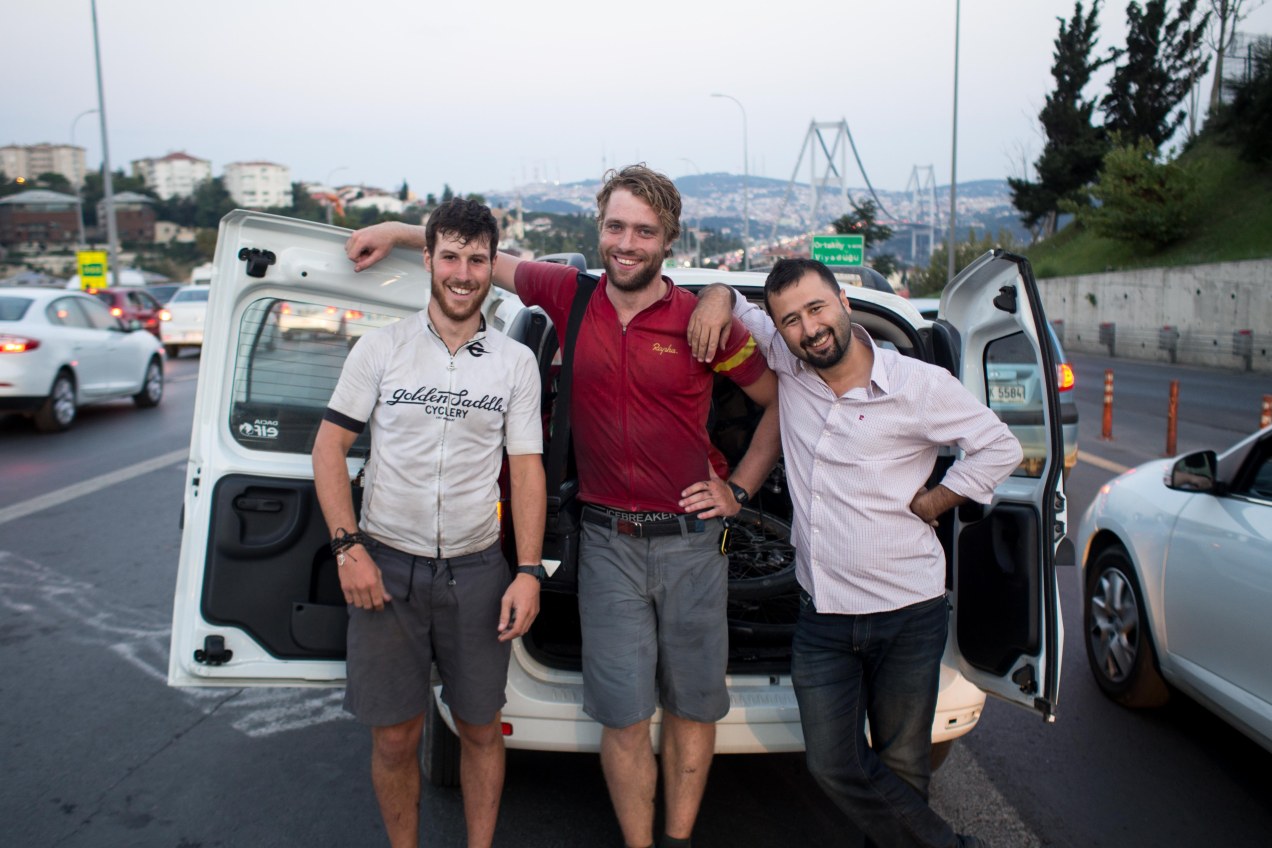 Luckily while the police were trying to figure out how to get us off the 5 lane highway leading to the bridge, a man sticks his head out of his van and offers us a lift. We stick our bikes in the back of the van and we’re off.